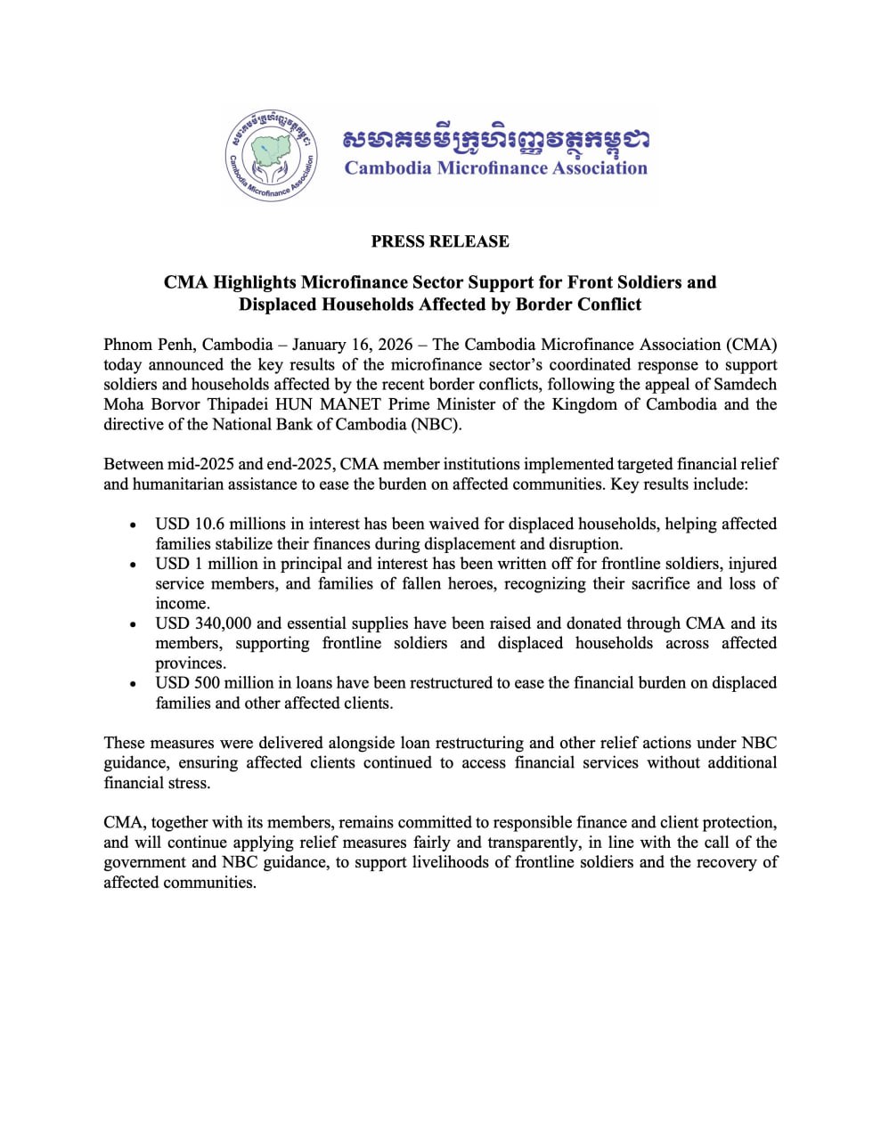 Phnom Penh, Cambodia – January 16, 2026 – The Cambodia Microfinance Association (CMA) today announced the key results of the microfinance sector’s coordinated response to support soldiers and households affected by the recent border conflicts, following the appeal of Samdech Moha Borvor Thipadei HUN MANET Prime Minister of the Kingdom of Cambodia and the directive of the National Bank of Cambodia (NBC).